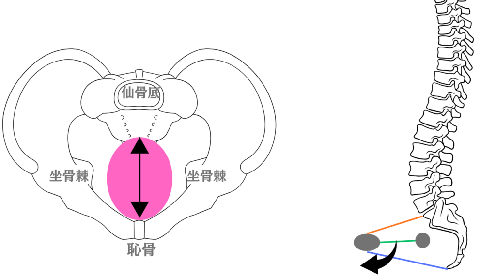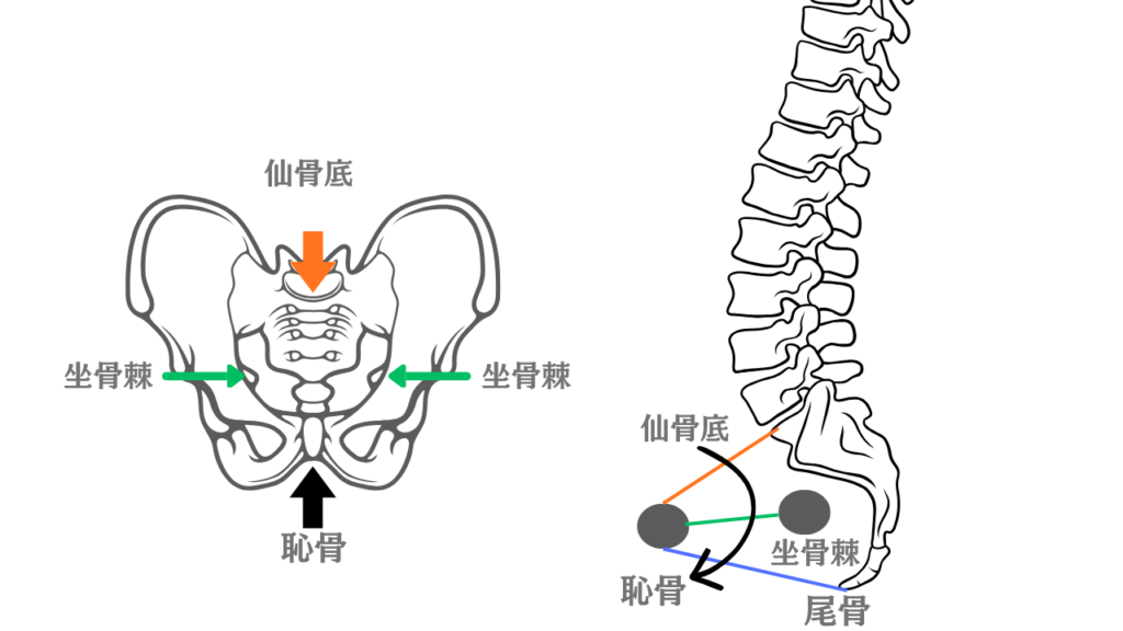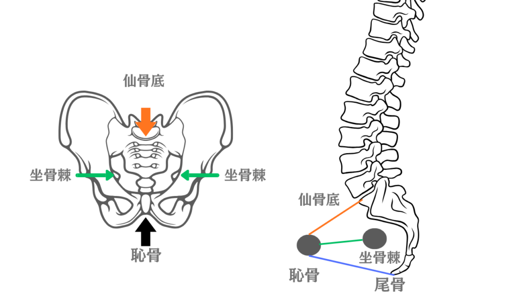 上の図は産道の簡単な図となります。オレンジのラインは恥骨から仙骨上部の仙骨底を結んだラインで産道の入口を示しています。青いラインは恥骨と尾骨先端を結んだラインは産道の出口を示しています。緑のラインは恥骨と坐骨棘を結んだラインで、産道入口と産道出口の中間点になります。