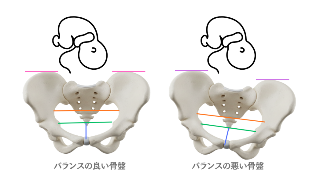 母胎の骨盤のバランスが良い場合と悪い場合で比較して見ましょう。先ずはピンクのラインと紫のラインで示した全体のバランスです。胎児が双方の骨盤にいた場合を想像してみてください。胎児の胎位は左側の骨盤の方が合理的なポジションが取れると容易に想像できるでしょう。左右非対称となる右側の骨盤では難しい胎位を取る事を強いられるでしょう。この母体の骨盤のバランスによる胎位への影響はバーストラウマを発生させる大きな要因と言えます。