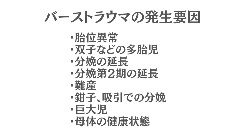 西東京市のトップカイロプラクティックです。今回は妊婦さんの骨格が新生児に与える影響についてお話ししたいと思います。内容としては私が2020年に行った「バーストラウマと妊婦のアジャスト」、2023年に行った「Birth Process 正軸侵入 不正軸侵」という2つのセミナーの簡単な要約となります。新生児は胎児期~出生過程においてバーストラウマという出生時外傷を被ります。これは生まれながらに新生児に存在する、先天的な骨格的ダメージと言えます。英国のスティーブ・ウィリアムス先生のセミナーによりますと、バーストラウマが発生する要因は以下になります。