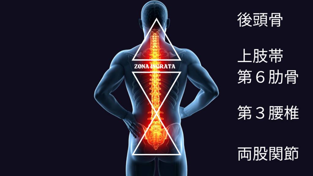 このバランスの崩れは身体の3つの三角形のバランスを崩します。NYのシンドリッチ先生のセミナーでは、最下部の三角形は両股関節を底辺として第3腰椎を頂点とした三角形となります。この三角形には股関節、仙腸関節、腰仙関節、大腰筋下部が含まれます。中央の三角形は第3腰椎から反転して第6肋骨を底辺とした逆三角形となります。この三角形には横隔膜、大腰筋上部が含まれます。最上位の三角形は上肢帯、第1第2肋骨を底辺として後頭骨を頂点とした三角形となります。この三角形には僧帽筋、胸鎖乳突筋、斜角筋群、後頭下筋群、後頭環椎関節が含まれます。腰部を含む最下部の三角形がバランスを崩した場合、上部2つの三角形も連動してバランスを崩します。