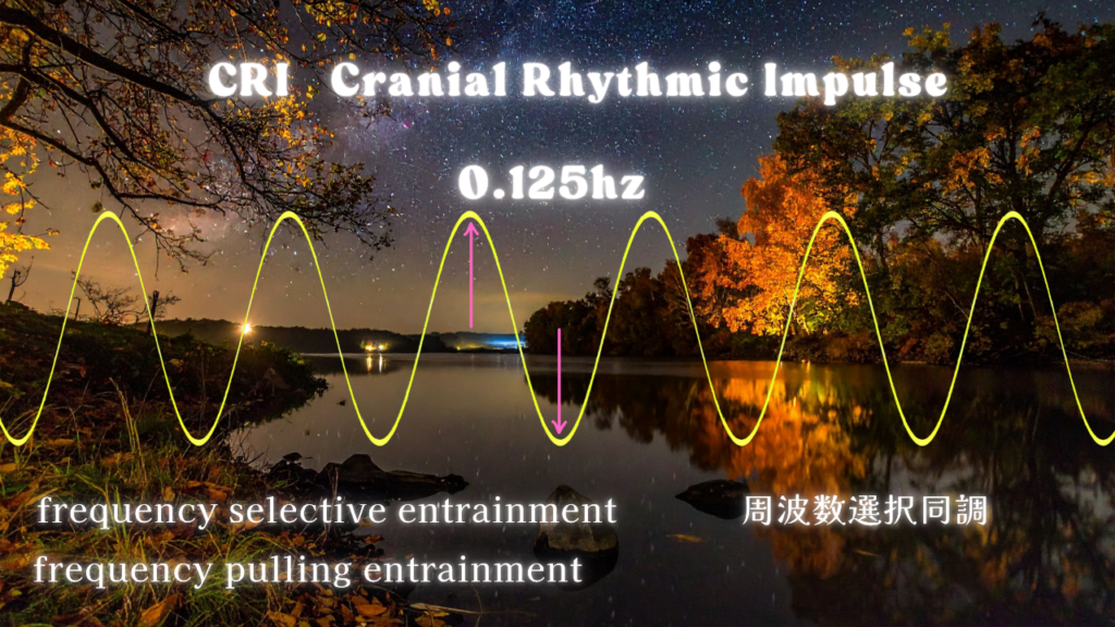 CRIサイクル1周期8秒(0.125hz)の場合、仙骨、呼吸、脊柱に1周期10秒(0.1hz)のリズムを加える事でCRIのレートはよりゆっくりしたリズムに引き込まれます。これによってより大きな脳脊髄液の波が生じます。