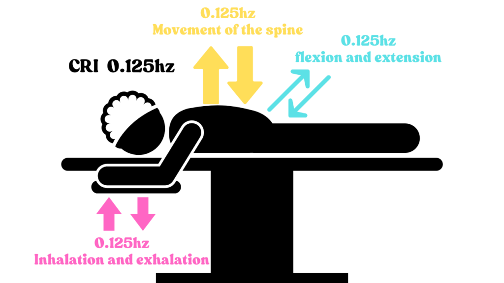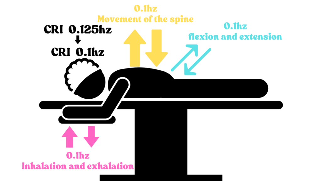 CRIサイクル1周期8秒(0.125hz)の場合、仙骨、呼吸、脊柱に1周期10秒(0.1hz)のリズムを加える事でCRIのレートはよりゆっくりしたリズムに引き込まれます。これによってより大きな脳脊髄液の波が生じます。