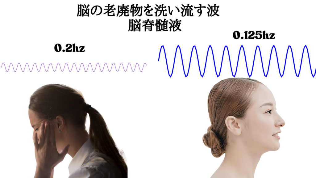 また40hzの振動がアクアポリン4というものを活性化して脳脊髄液の流入量を増やしていることも解ってきました。当院では現在患者さんによって40hzの振動音を流しています。睡眠時に大きな波として老廃物を洗い流す脳脊髄液ですが、この場合は脳の血流量をコントロールする電気信号の同期が流入量の動力と言えます。この同期現象は覚醒時には起こりません。